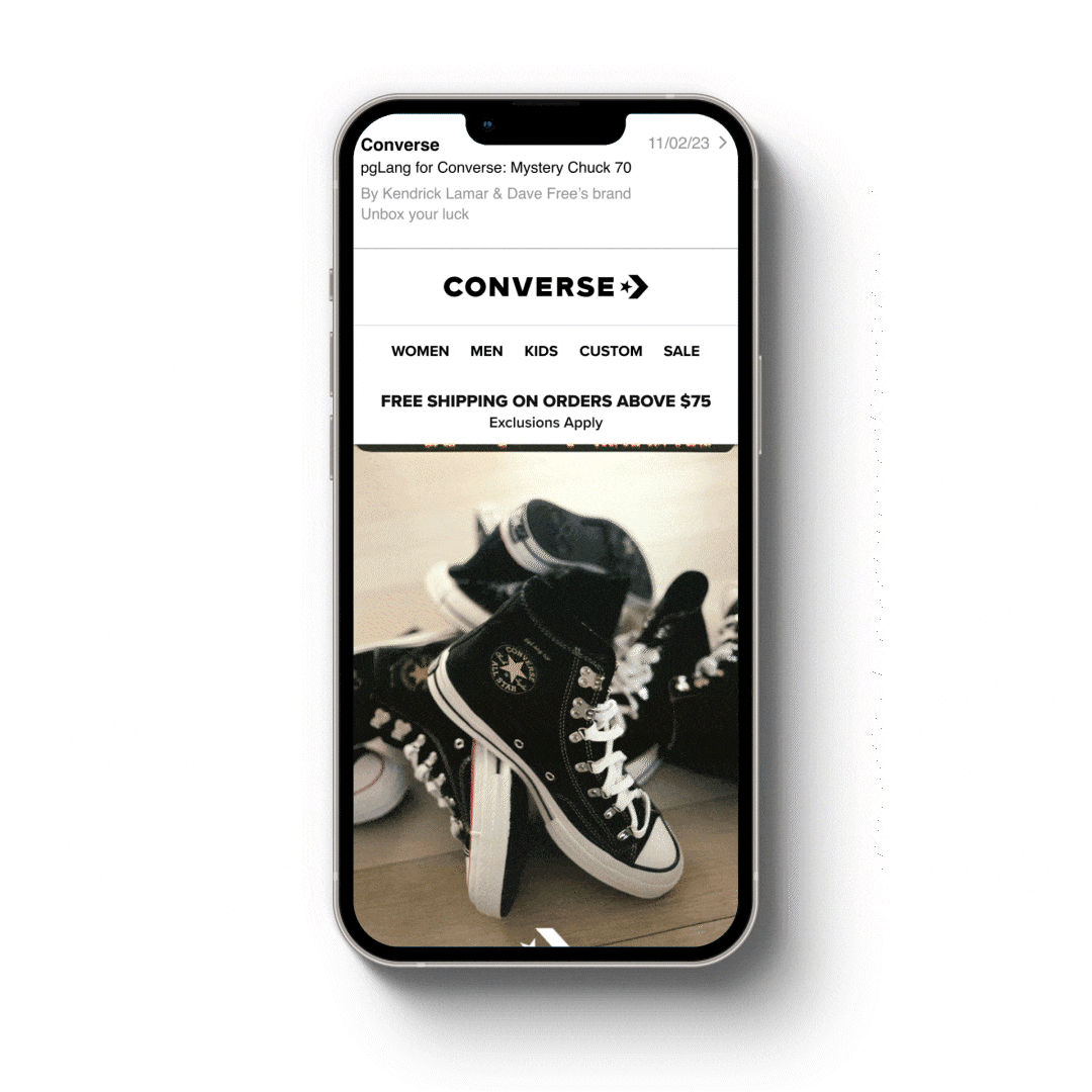 Collaboration campaign with pg Lang, created assets that clearly aligned to partner standards and embodied the mystery and fantastical nature of pg Lang’s project, with a strong focus on fate. The product had a same-day 100% sell through. Campaign included: emails, converse.com homepage, wayfinding, and product display pages.